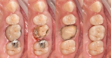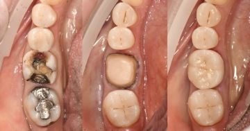 Rekonstrukce zubu 26 (nahoře vpravo) celokeramickou korunkou